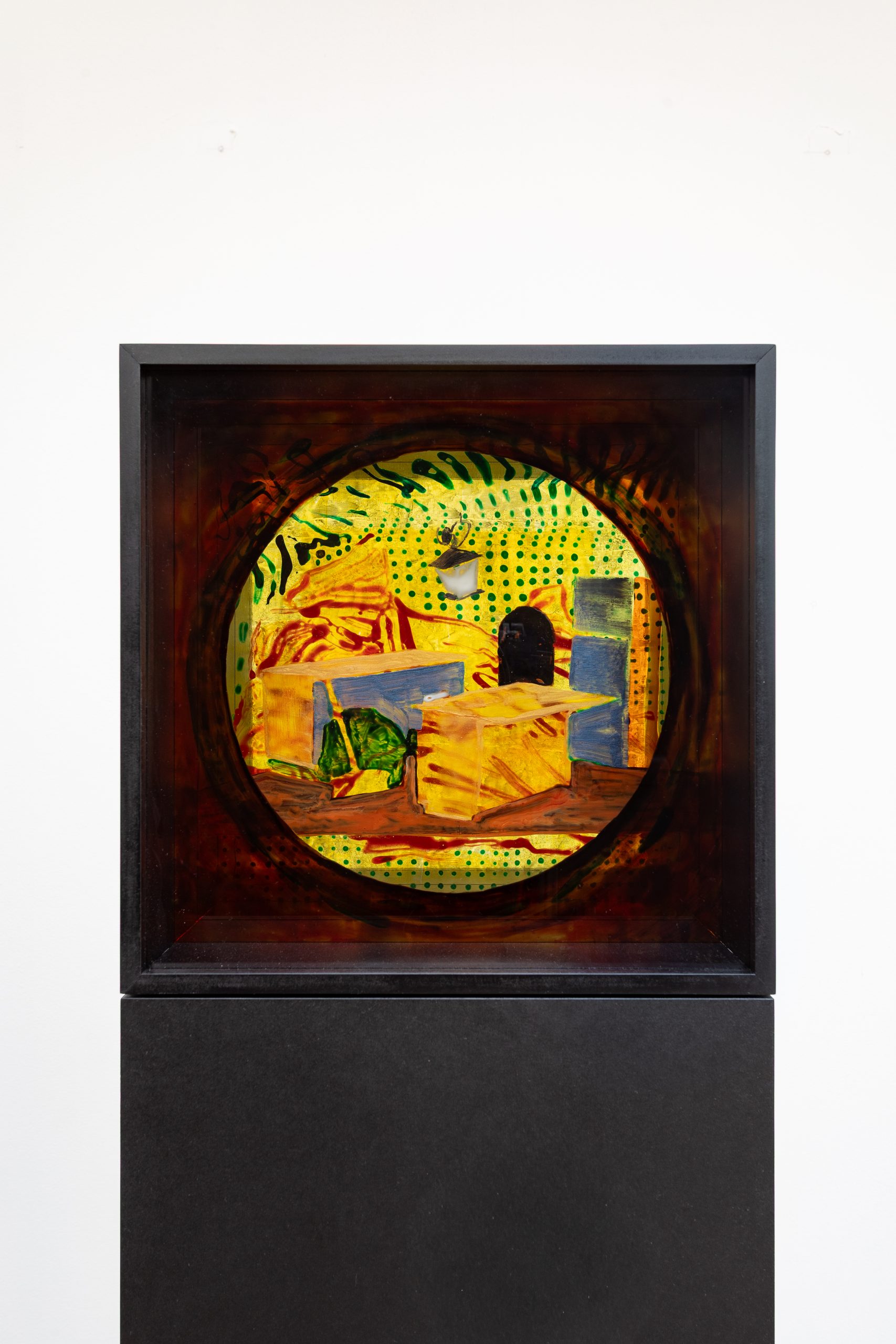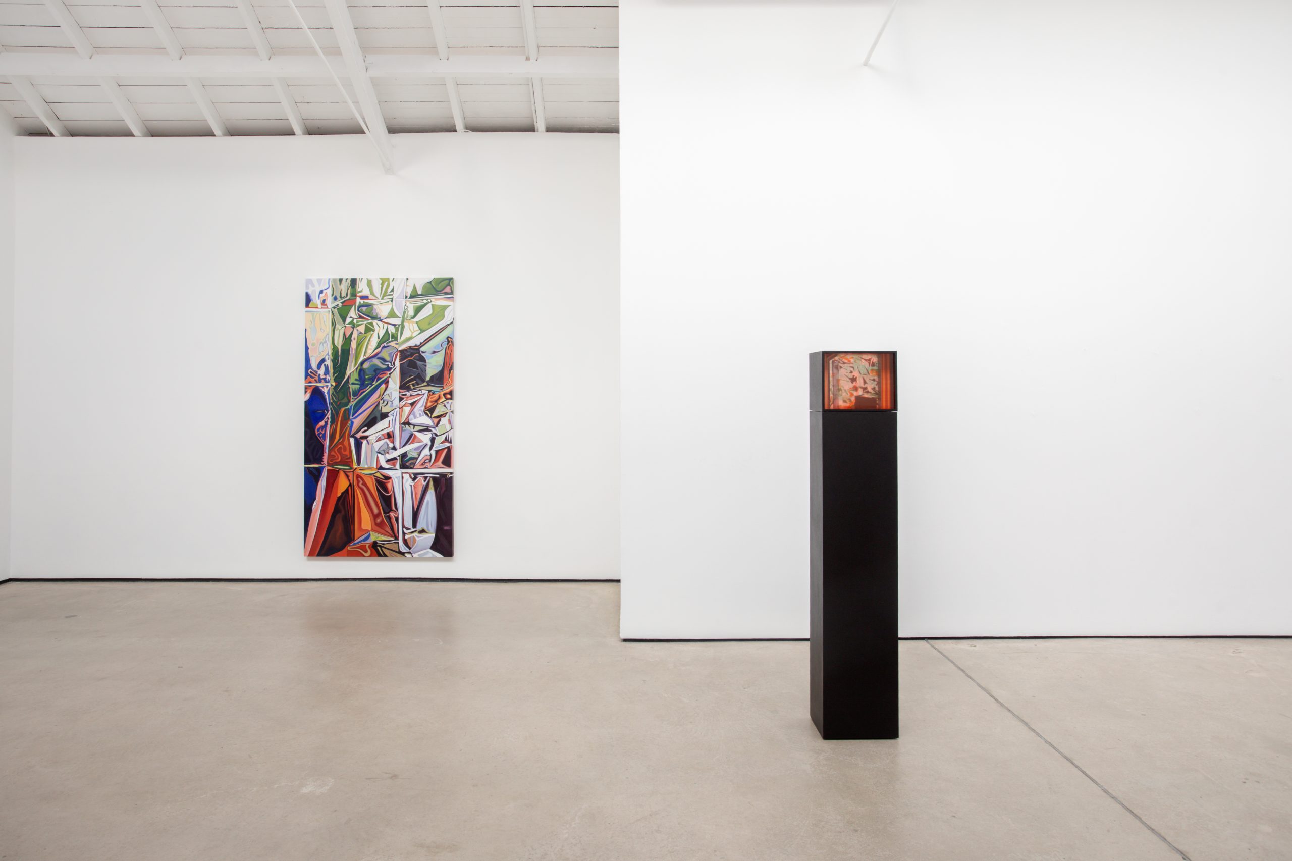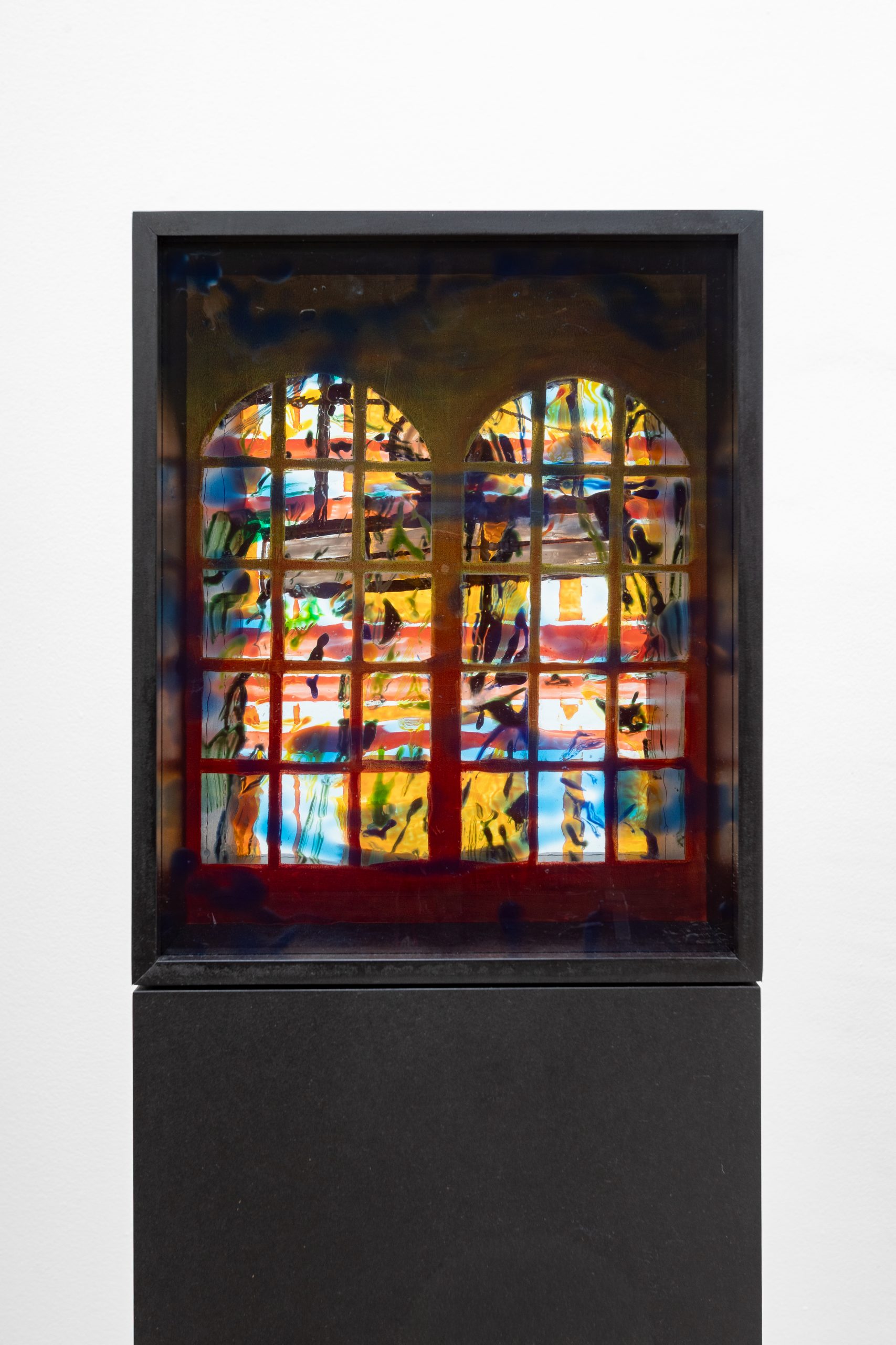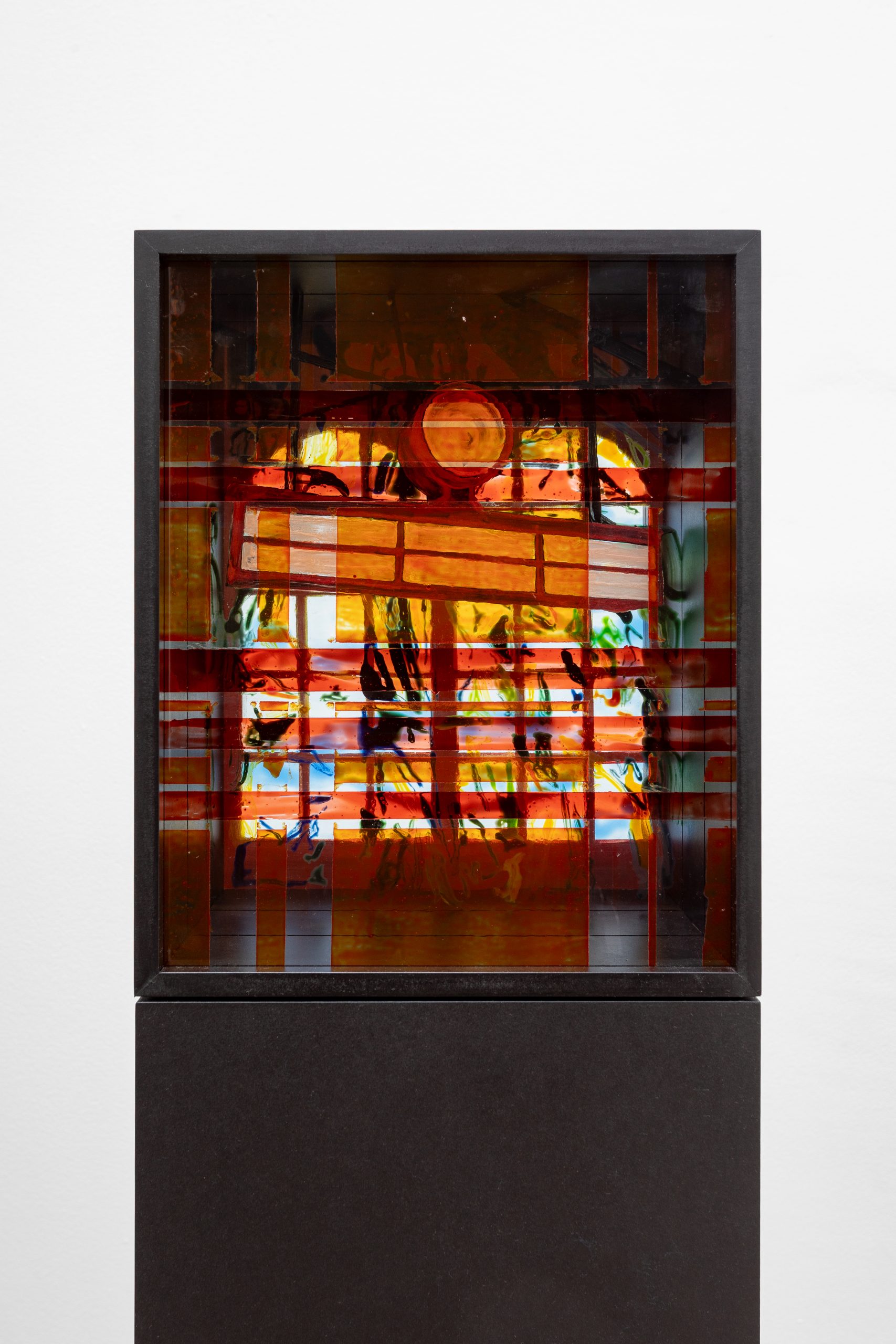 Composite 1, oil, Flashe and glass paints on glass, oiled MDF, 156.2 x 21.2 x 21.2 cm, 2025